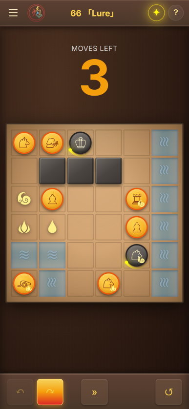 This defies the intuition of turn-based games. Either one side moves one piece, or—like in tactics games—both sides’ pieces can each act once per turn. But “I move once, enemies move many times” suits this game’s puzzle format: Red must win within N moves, so it’s already mechanically asymmetric—in most levels, Red doesn’t even have a King, only attacking pieces. Once I understood this, I could design simple, predictable behavior rules for enemy pieces while flexibly adjusting the number of AI pieces to fine-tune each turn’s pressure and cognitive load. And “defeating many with few,” “wit over brute force”—that fits the game’s theme perfectly.
