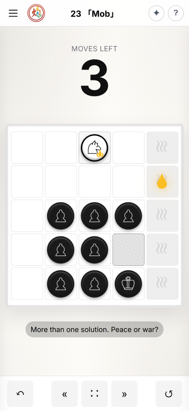 This defies the intuition of turn-based games. Either one side moves one piece, or—like in tactics games—both sides’ pieces can each act once per turn. But “I move once, enemies move many times” suits this game’s puzzle format: Red must win within N moves, so it’s already mechanically asymmetric—in most levels, Red doesn’t even have a King, only attacking pieces. Once I understood this, I could design simple, predictable behavior rules for enemy pieces while flexibly adjusting the number of AI pieces to fine-tune each turn’s pressure and cognitive load. And “defeating many with few,” “wit over brute force”—that fits the game’s theme perfectly.
