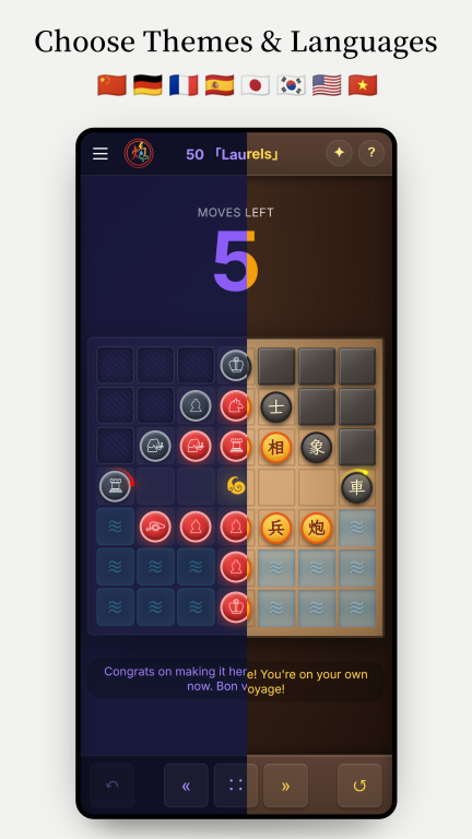 For the gameplay loop, I immediately zeroed in on “endgame puzzles.” I could use the classic “continuous check” format—where Red must check Black on every move—to showcase the new piece abilities while keeping the game tight and engaging. After all, this is a format that hundreds of years of Chess/Xiangqi endgame design have refined. My working title, scribbled in my notebook at the time, was the rather uninspired “Check On.” Later, for various reasons, I didn’t use “continuous check” as the guiding constraint, relaxing it to “win within 3-5 moves”—keeping each puzzle’s playtime and complexity within casual mobile game territory.