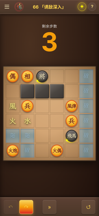 这是违背对弈类游戏的直觉的。要么一方走一子,要么和战棋游戏一样,双方的每个子,在一回合中都可以分别行动。但「我一动、敌多动」适合本游戏的闯关解谜机制:红方需要在N步之内获胜,这本来就不是一个机制对称的游戏——在大部分关卡中,红方甚至都没有帅/将,全是进攻子力。只要想通了这点,我便可以为敌棋设计简单、容易被玩家掌握的行动规则,同时灵活调整AI棋子的多少来打磨单个回合的压迫感和思考量。而「以少胜多」、「智胜蛮力」,也非常符合游戏主题。